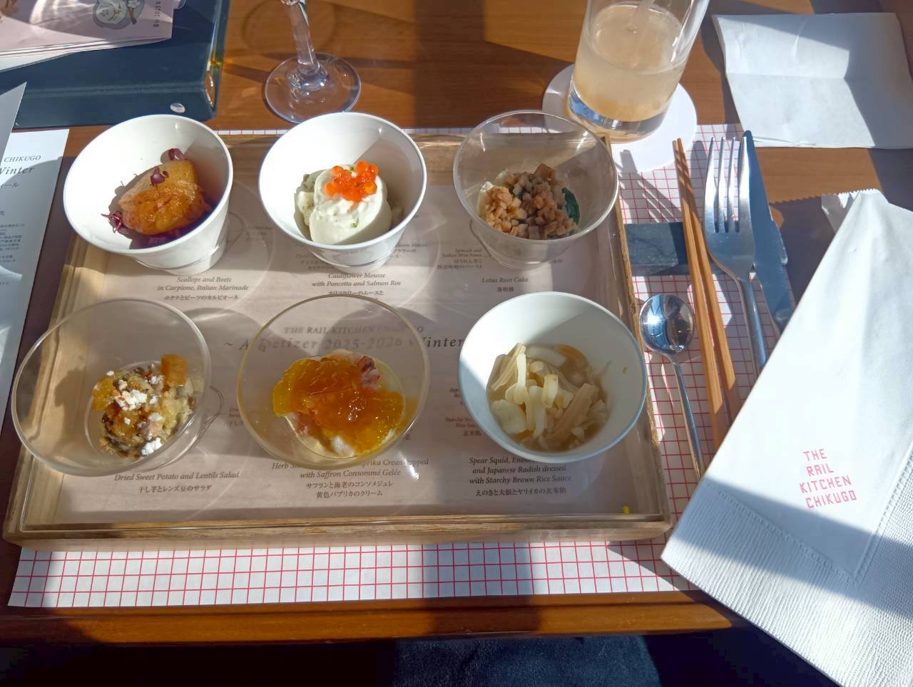 列車に戻ってからは、お楽しみの食事タイム。盛り付けや食器までおしゃれで、